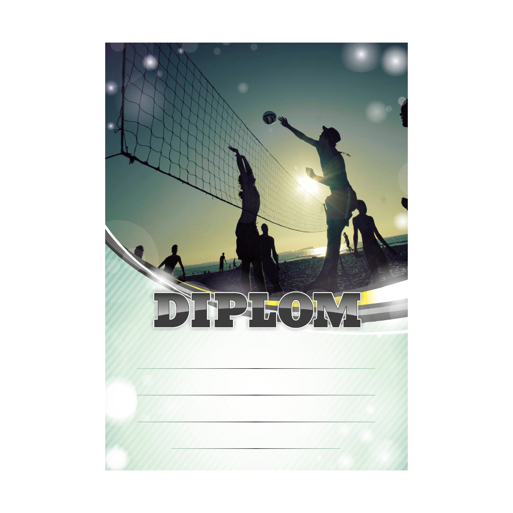 Zelený diplom PLÁŽOVÝ VOLEJBAL 6637 s volejbalisty u sítě, se zeleným polem pro 4 řádky textu a černým nápisem DIPLOM. Beach volejbalový diplom 6637 máme ve formátu A4 a A5. Papírový diplom s motivem BEACH VOLEJBAL má gramáž 250 g/m2.