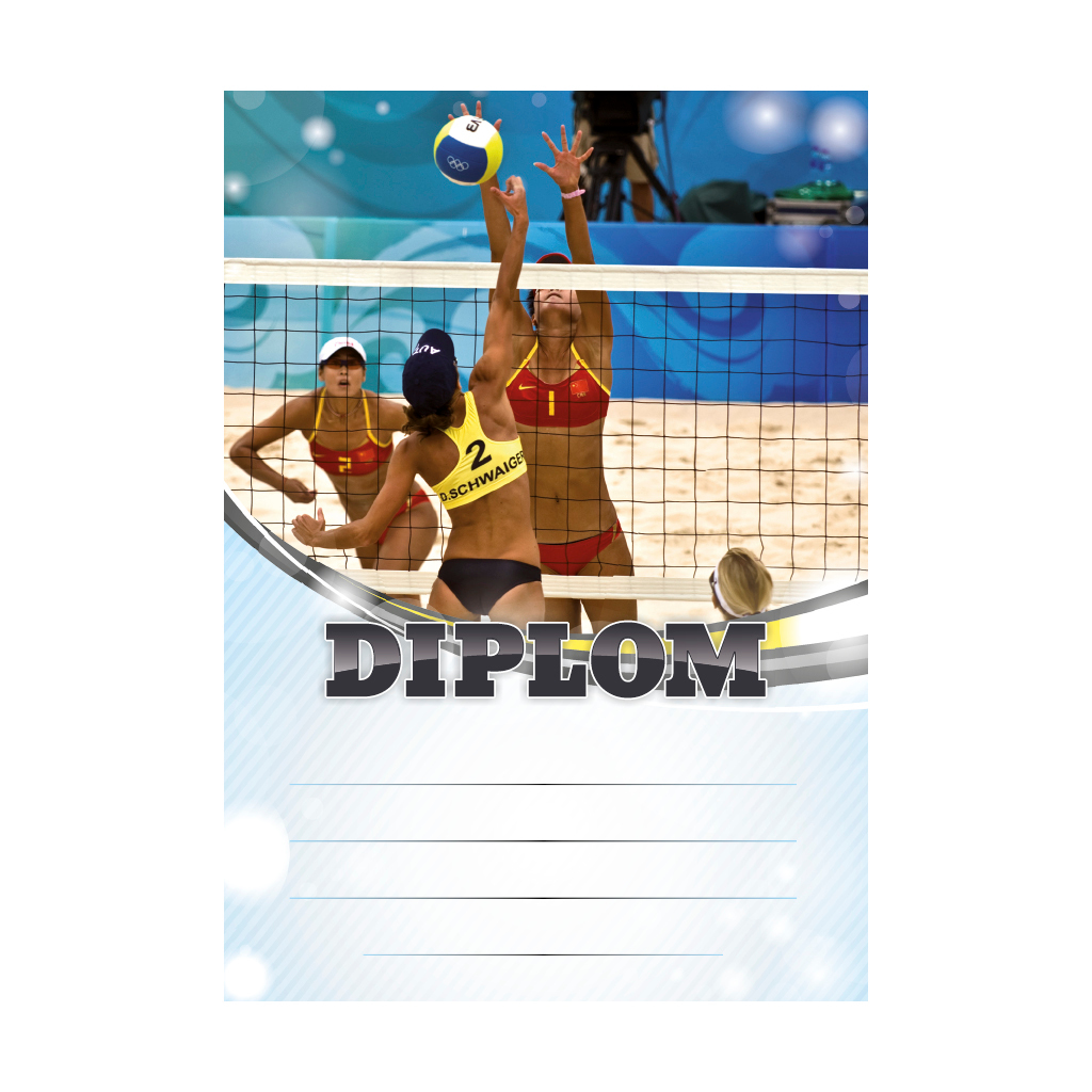 Modrý diplom PLÁŽOVÝ VOLEJBAL 6638 s volejbalistami u sítě, s bledě modrým polem pro 4 řádky textu a černým nápisem DIPLOM. Beach volejbalový diplom 6638 máme ve formátu A4 a A5. Papírový diplom s motivem BEACH VOLEJBAL má gramáž 250 g/m2.