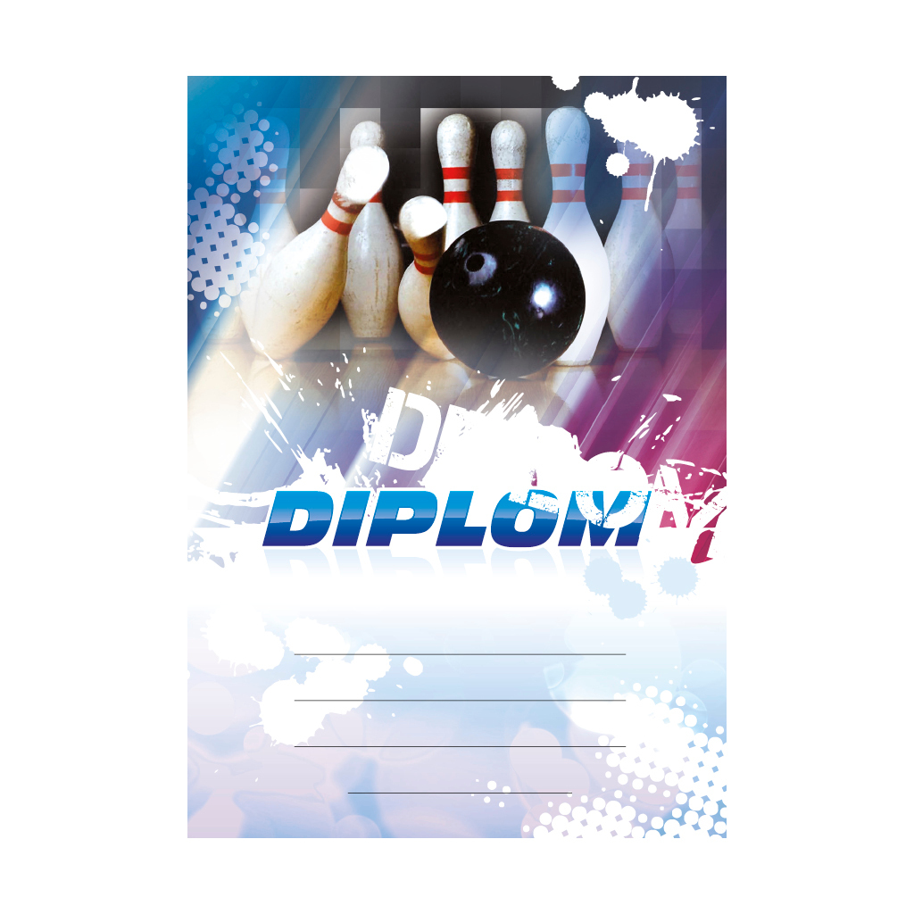 Modrý diplom BOWLING 6668 s černou bowlingovou koulí srážející kuželky, s polem pro 4 řádky textu a modrým nápisem DIPLOM. Bowlingový diplom 6668 máme ve formátu A4 a A5. Papírový diplom s motivem bowlingu a kuželek má gramáž 250 g/m2.