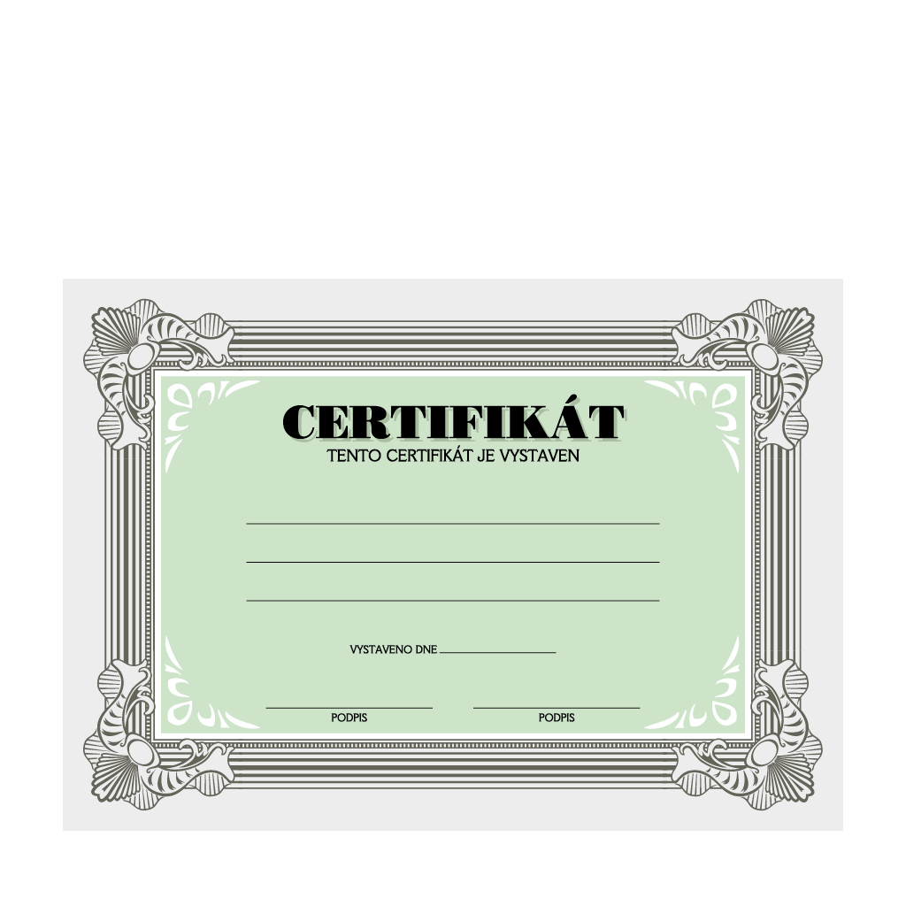 Zelený certifikát 6710 na zeleném pozadí s šedým ornamentálním rámečkem. Certifikát má pole pro 3 řádky textu, pole pro datum, dvě pole pro podpis a černý nápis CERTIFIKÁT provedený patkovým písmem. Hodí se jako potvrzení absolvování různých školení a kurzů. Certifikát 6710 máme ve formátu A4 a A5. Papírový certifikační listina má gramáž 250 g/m2.