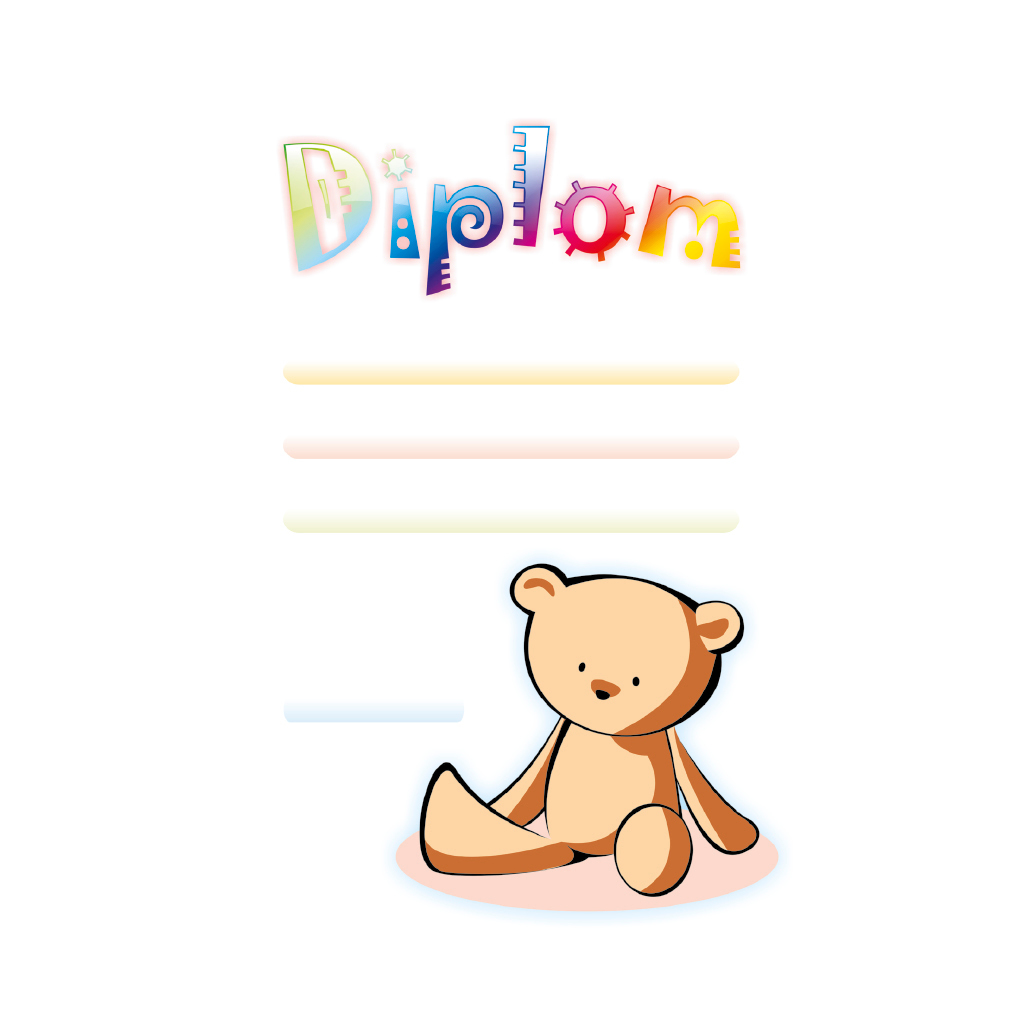 Barevný dětský diplom 6701 s medvídkem. Dětský diplom má pole pro 3 řádky textu a nápis DIPLOM v duhové barvě. Univerzální dětský diplom 6701 máme ve formátu A4 a A5. Papírový diplom s dětským motivem medvídka má gramáž 250 g/m2.