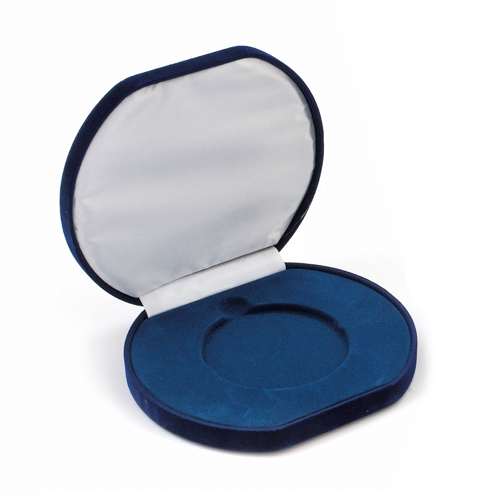 Oválná sametová etue pro medaile o průměru 70 mm. Neprůhledná krabička má rozměr 140x120 mm s modrou sametovou vložkou, do které se vsadí medaile. Etue jsou vhodné pro pamětní medaile a pro významné sportovní či kulturní události.