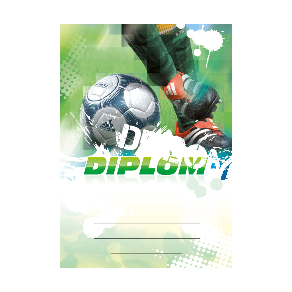 Zelený fotbalový diplom 6603 s fotbalovým míčem na trávníku a kopačkami, se světle zeleným polem pro 4 řádky textu a zeleným nápisem DIPLOM. Fotbalový diplom 6603 máme ve formátu A4 a A5. Papírový diplom má gramáž 250 g/m2.