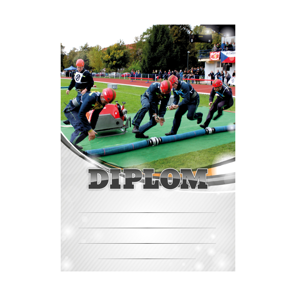 Hasičský diplom POŽÁRNÍ SPORT 6675 s hasiči při požárním sportu, s šedým polem pro 4 řádky textu a černým nápisem DIPLOM. Hasičský diplom 6675 máme ve formátu A4 a A5. Papírový diplom s motivem požárního sportu má gramáž 250 g/m2.