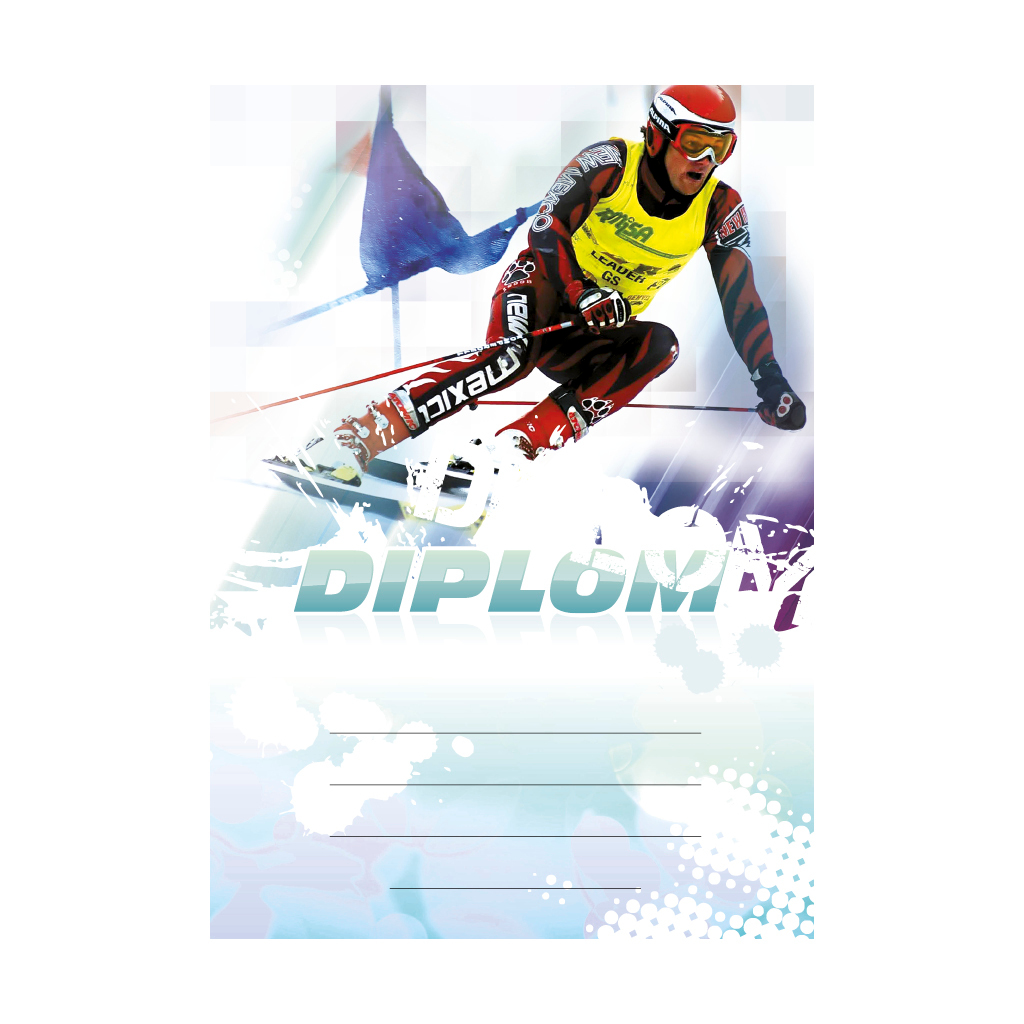 Papírový diplom SJEZDOVÉ LYŽOVÁNÍ 6647 s lyžařem při slalomovém lyžování, s polem pro 4 řádky textu a zeleným nápisem DIPLOM. Lyžařský diplom 6647 máme ve formátu A4 a A5. Papírový diplom s motivem slalomu má gramáž 250 g/m2.