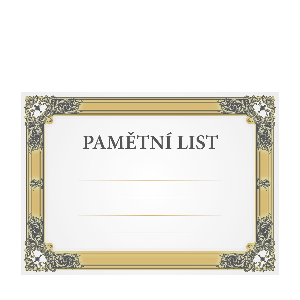 Univerzální pamětní list 6711 na šedém podkladu se zdobným ornamentálním rámečkem zlaté barvy. Diplom má pole pro 4 řádky textu a černý nápis PAMĚTNÍ LIST vyvedený patkovým písmem. Univerzální pamětní list 6711 máme ve formátu A4 a A5. Papírový pamětní list má gramáž 250 g/m2.