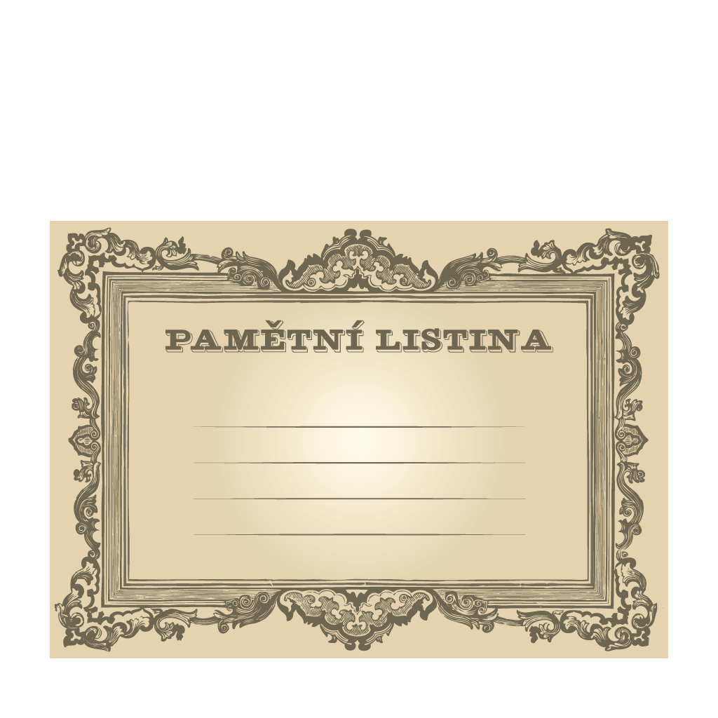 Univerzální pamětní listina 6713 na zažloutlém papíře s ornamentálním rámečkem. Pamětní list má pole pro 4 řádky textu a nápis PAMĚTNÍ LISTINA provedený patkovým písmem. Hodí se jako upomínka různých událostí. Pamětní list 6713 máme ve formátu A4 a A5. Papírová pamětní listina má gramáž 250 g/m2.