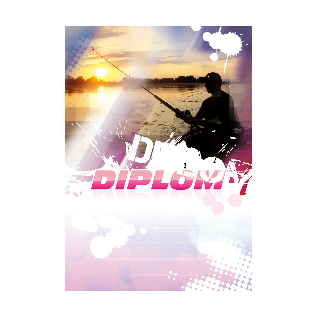 Růžový diplom RYBOLOV 6684 s rybářem při západu slunce, s polem pro 4 řádky textu a růžovým nápisem DIPLOM. Rybářský diplom 6684 máme ve formátu A4 a A5. Papírový diplom s motivem rybáře má gramáž 250 g/m2.