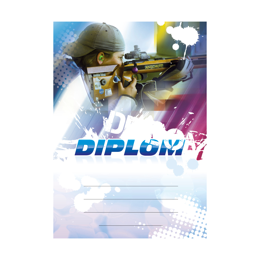 Modrý diplom STŘELBA 6653 se střelcem se vzduchovkou / malorážkou, s polem pro 4 řádky textu a modrým nápisem DIPLOM. Střelecký diplom 6653 máme ve formátu A4 a A5. Papírový diplom s motivem sportovní střelby má gramáž 250 g/m2.