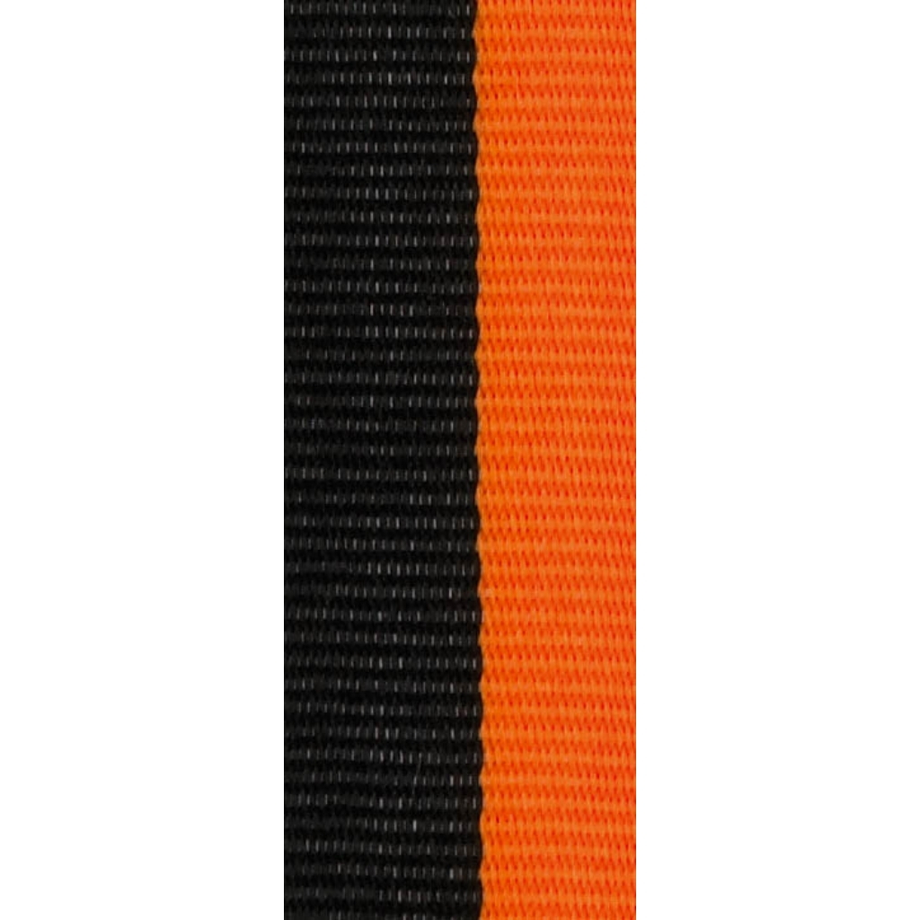 Stužka na medaili v černooranžové kombinaci s kovovou sponkou ve zlaté barvě.