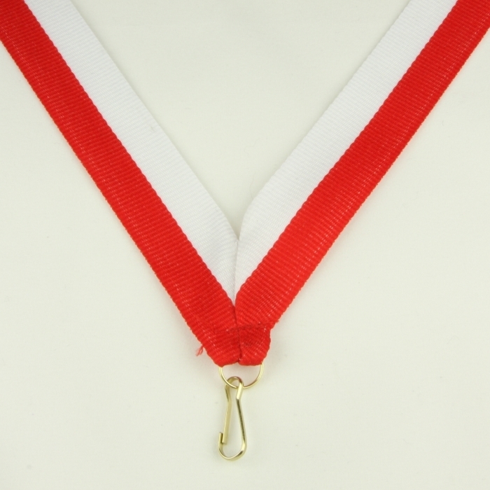 Červenobílá stužka na medaili s kovovou sponkou ve zlaté barvě.