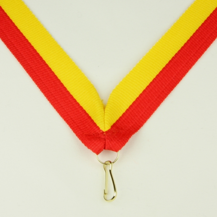 Stužka na medaili ve žlutočervené barvě s kovovou sponkou ve zlaté barvě.