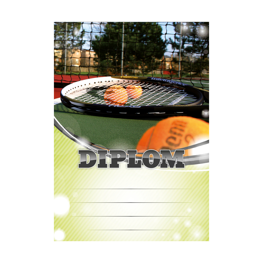 Zelený tenisový diplom 6619 s tenisovou raketou a oranžovými míčky u tenisové sítě, se zeleným polem pro 4 řádky textu a černým nápisem DIPLOM. Tenisový diplom 6619 máme ve formátu A4 a A5. Papírový diplom s motivem TENIS má gramáž 250 g/m2.