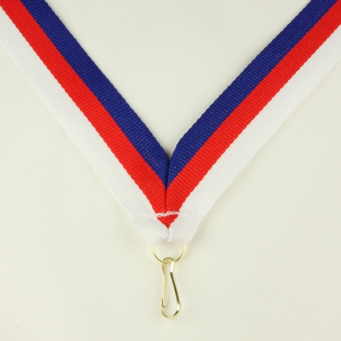 Stuha na medaili v barvě české trikolory se zlatou kovovou sponkou.