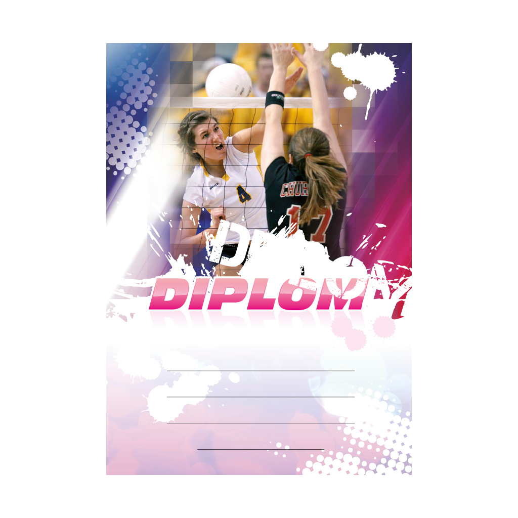 Růžový diplom VOLEJBAL 6635 s volejbalistkami u sítě, se světle růžovým polem pro 4 řádky textu a růžovým nápisem DIPLOM. Volejbalový diplom 6635 máme ve formátu A4 a A5. Papírový diplom s motivem VOLEJBAL má gramáž 250 g/m2.